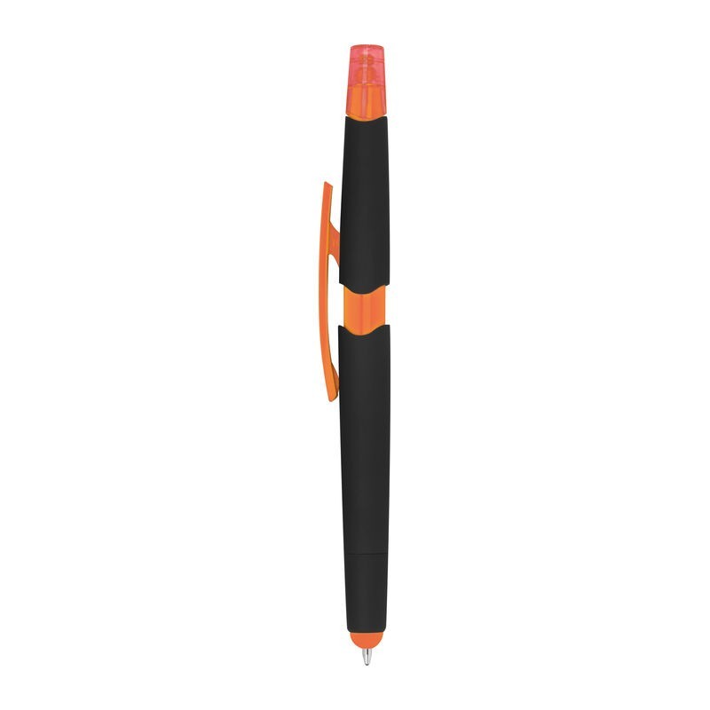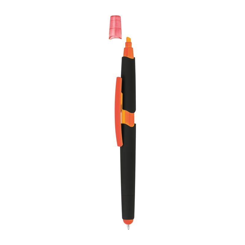 Műanyag golyóstoll szövegkiemelővel, gumírozott tolltesttel, kék tollbetéttel és érintőképernyős funkcióval.