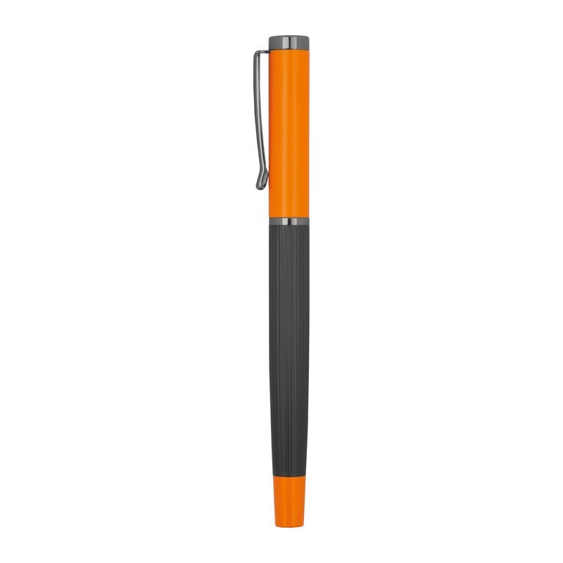 Elegáns, fém golyóstoll és rollertoll szett csíkos testtel, színes díszítőelemekkel és fényes fegyverfém részletekkel.