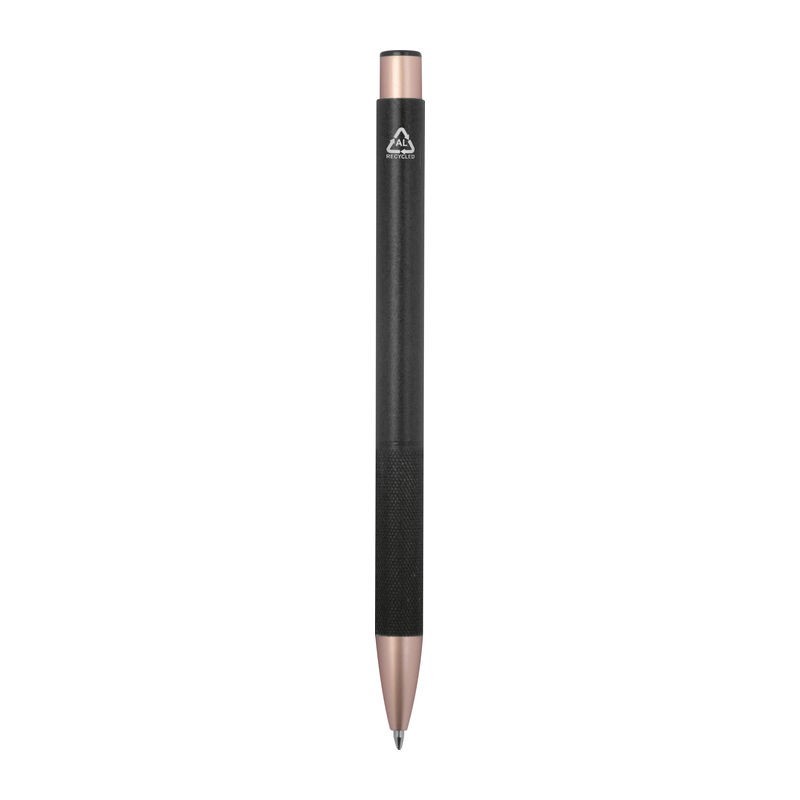 Újrahasznosított alumínium golyóstoll fémes felületű részekkel. Kék tollbetéttel szállítjuk.