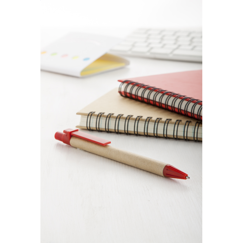 Újrahasznosított karton borítású spirálfüzet 80 db vonalas A5 méretű lapokkal. Tartalmaz egy újrahasznosított papírból készült golyóstollat kék tollbetéttel.