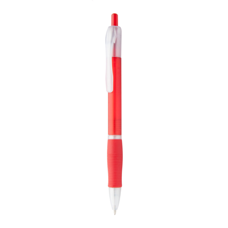 Műanyag golyóstoll gumírozott markolattal, áttetsző fehér klipsszel és tollheggyel. Kék tollbetéttel szállítjuk.