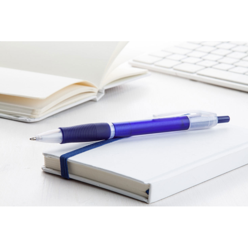 Műanyag golyóstoll gumírozott markolattal, áttetsző fehér klipsszel és tollheggyel. Kék tollbetéttel szállítjuk.
