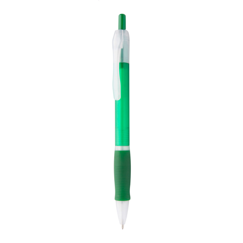 Műanyag golyóstoll gumírozott markolattal, áttetsző fehér klipsszel és tollheggyel. Kék tollbetéttel szállítjuk.