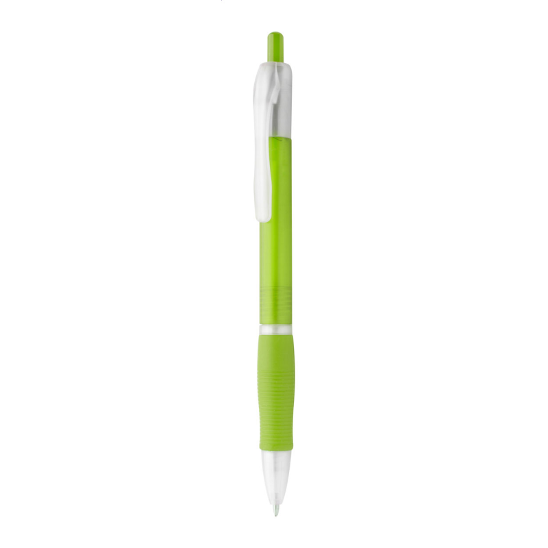 Műanyag golyóstoll gumírozott markolattal, áttetsző fehér klipsszel és tollheggyel. Kék tollbetéttel szállítjuk.