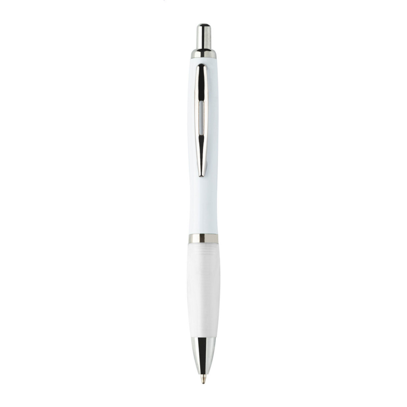 Újrahasznosított ABS műanyag golyóstoll fehér testtel, színes markolattal és króm részekkel. Kék tollbetéttel.