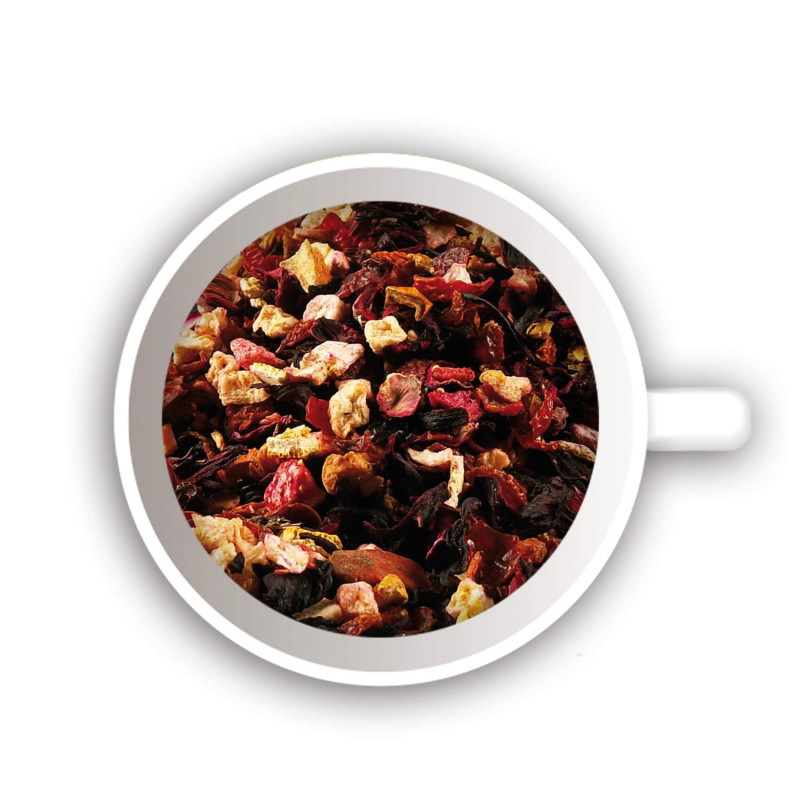Összetevői: hibiszkusz, eperdarabok, málnadarabok, csipkebogyó, almadarabok, narancshéj, aroma