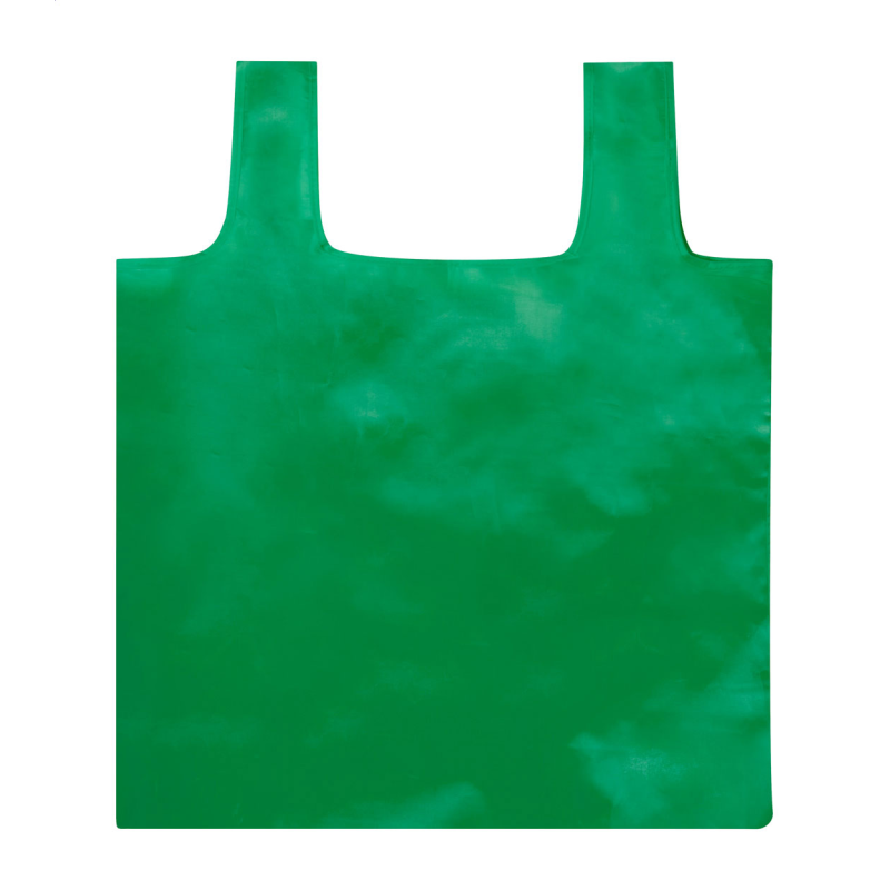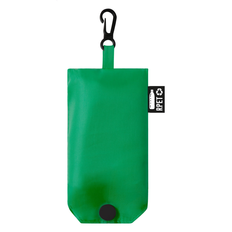 Összehajtható bevásárlótáska újrahasznosított PET poliészter anyagból, megkülönböztető RPET címkével.