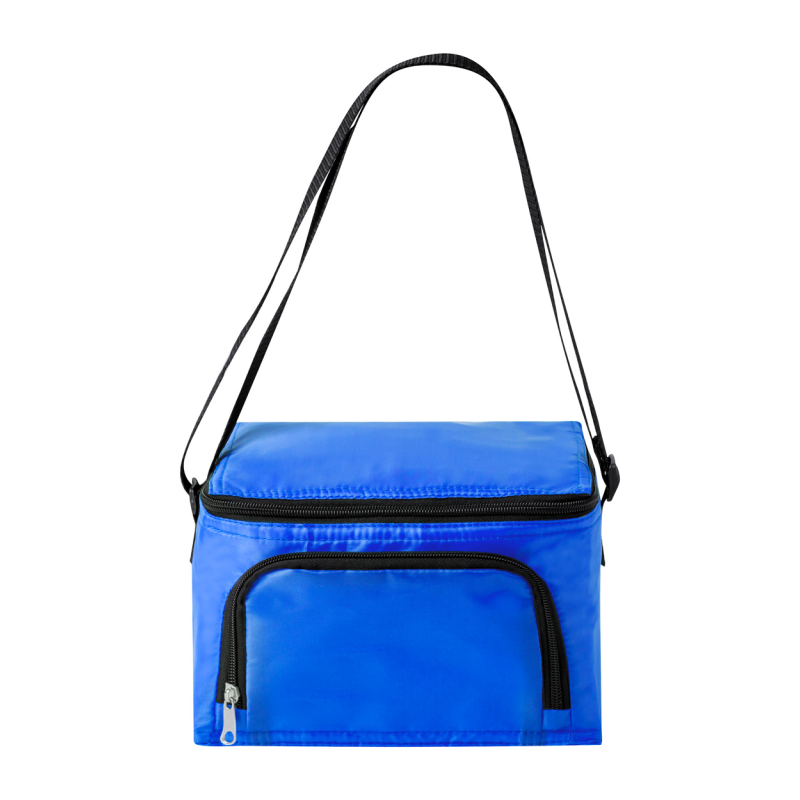Poliészter hűtőtáska cipzáras rekeszekkel, alumínium béléssel és fülekkel. 6 darab 0,33 l-es italdoboz tárolására. 210D poliészter.