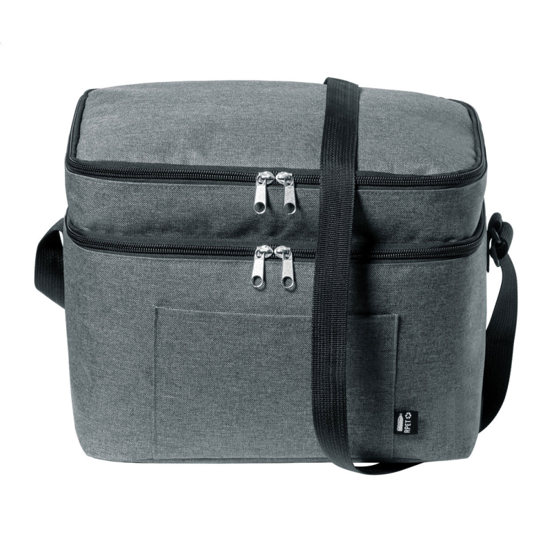 600D RPET polészterből készült hűtőtáska PEVA béléssel, 2 rekesszel és állítható vállpánttal. Megkülönböztető RPET címkével ellátva.