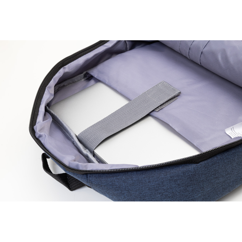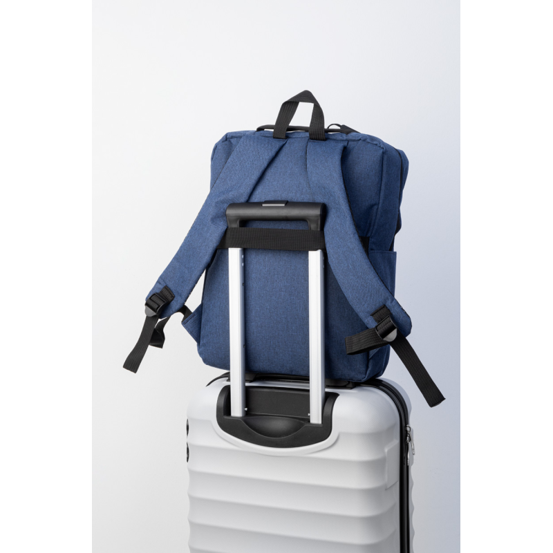 RPET hátizsák cipzáras főrekesszel, 2 cipzáras zsebbel, oldalzsebbel és párnázott laptoprekesszel (15"). Bőröndre rögzíthető, párnázott hát- és vállpántokkal. 600D RPET poliészter, megkülönböztető RPET címkével.