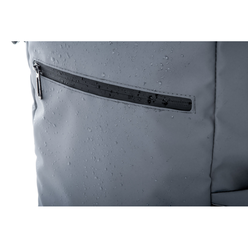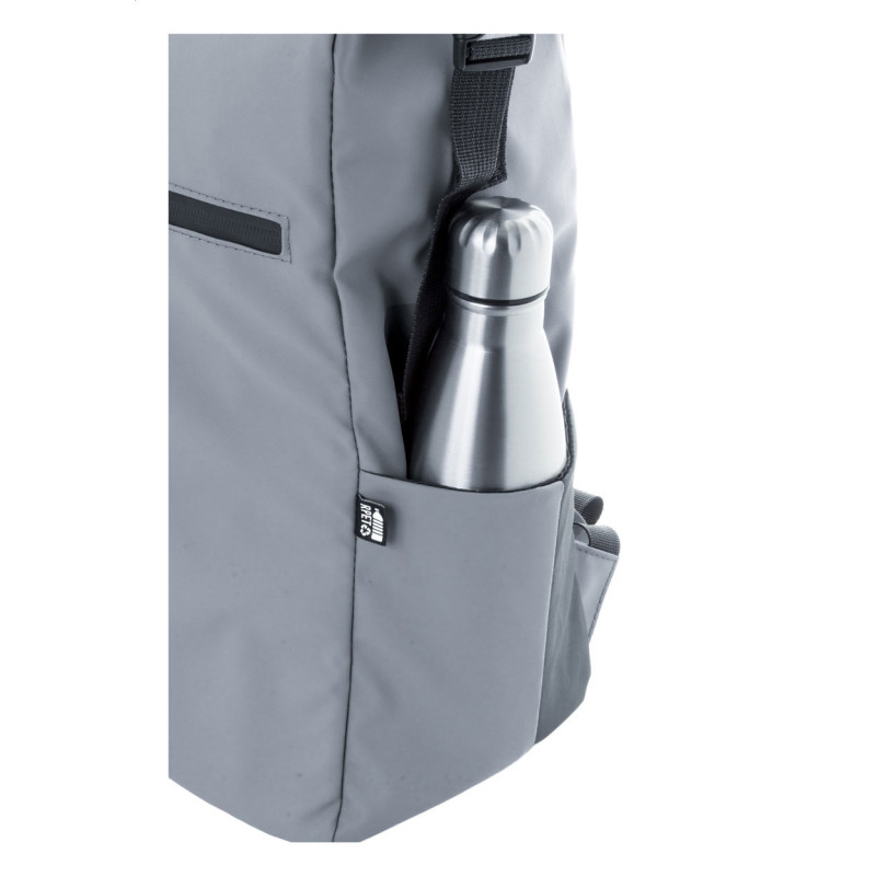 Vízálló, puha újrahasznosított PU bőr hátizsák cipzáras fő rekesszel, 2 cipzáras első zsebbel, oldalzsebekkel és párnázott laptop (15") és tablet (10") rekesszel.