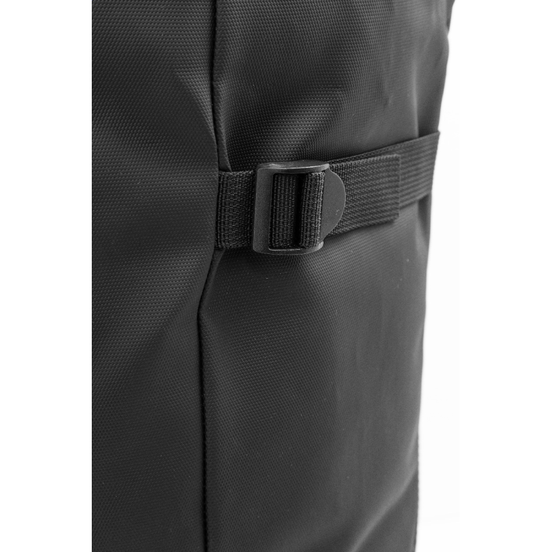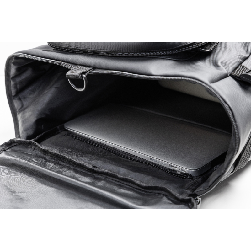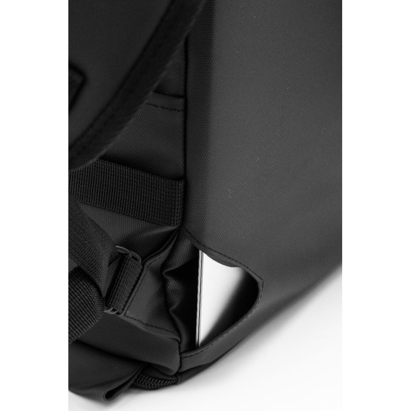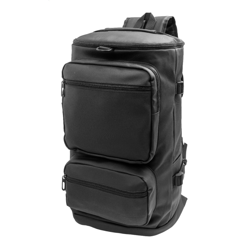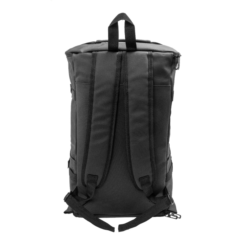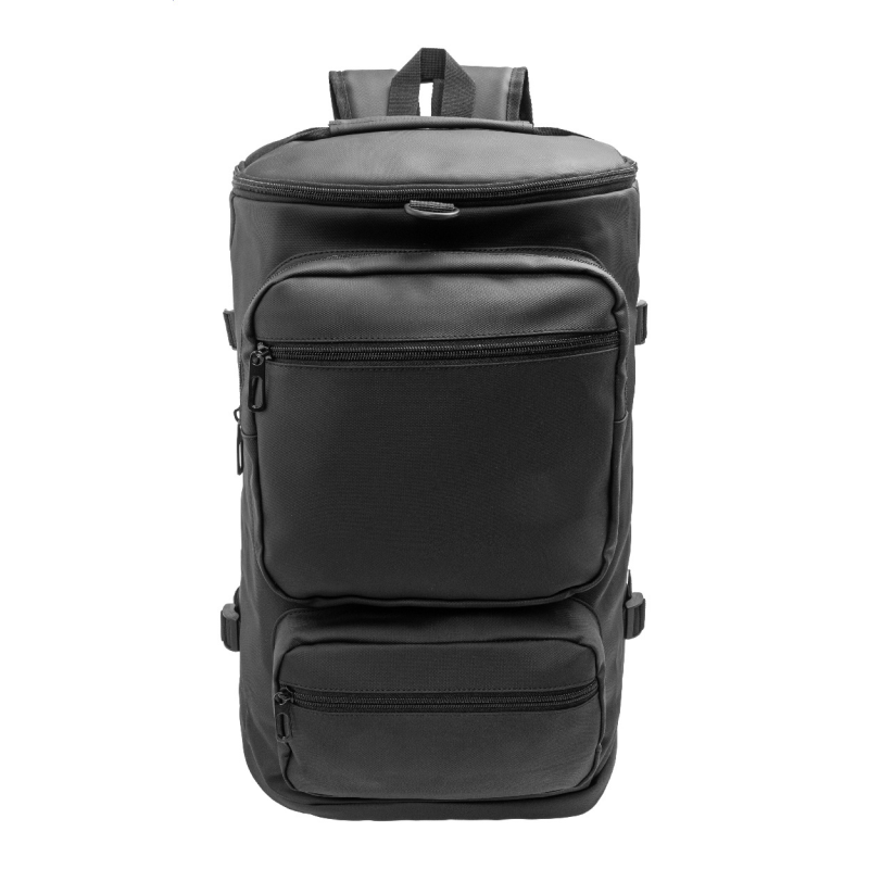 Vízálló RPET hátizsák cipzáras fő rekesszel, 2 cipzáras elülső zsebbel, oldalsó zsebekkel és cipőtartó rekesszel.