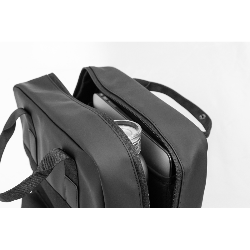 Vízálló RPET hátizsák 3 cipzáras fő rekesszel, 2 cipzáras első zsebbel, cipzáras oldalzsebbel és rejtett lopásgátló zsebbel.