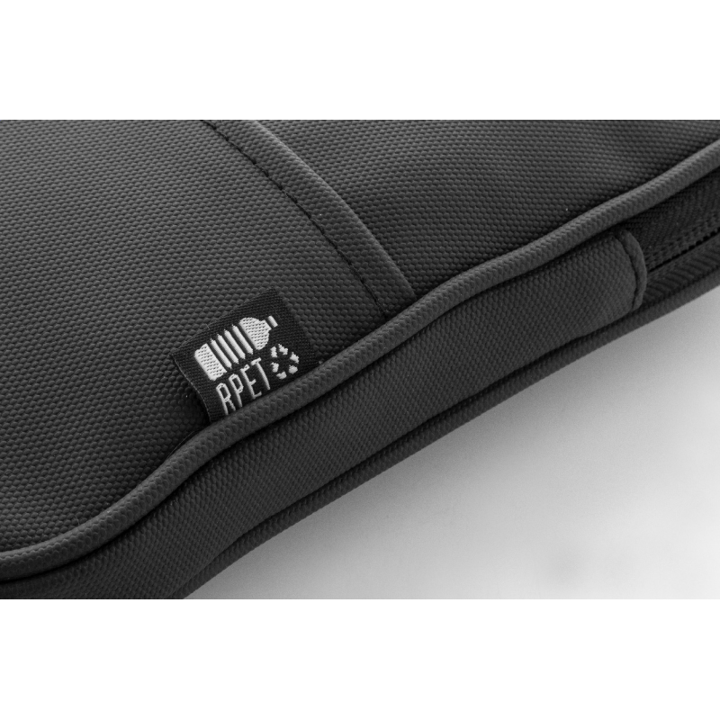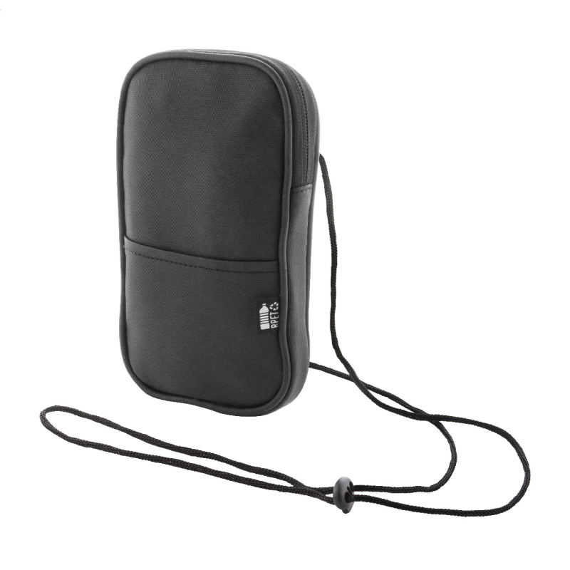 Egyedi gyártású cipzáras RPET pénztárca 600D poliészter anyagból, megkülönböztető RPET jelzéssel.