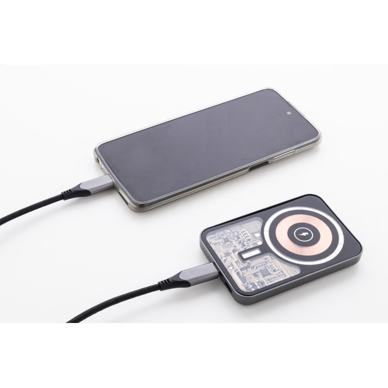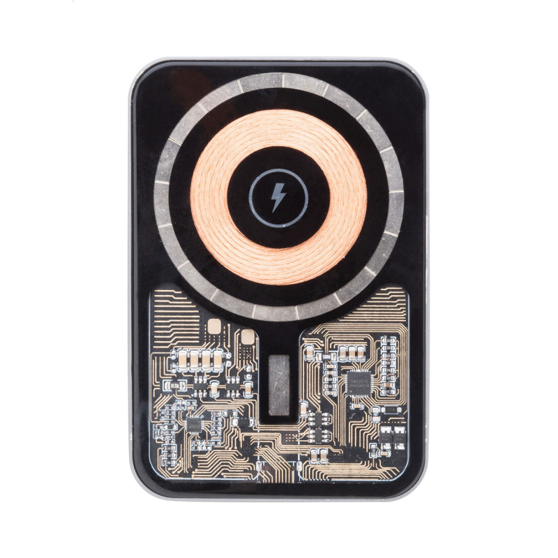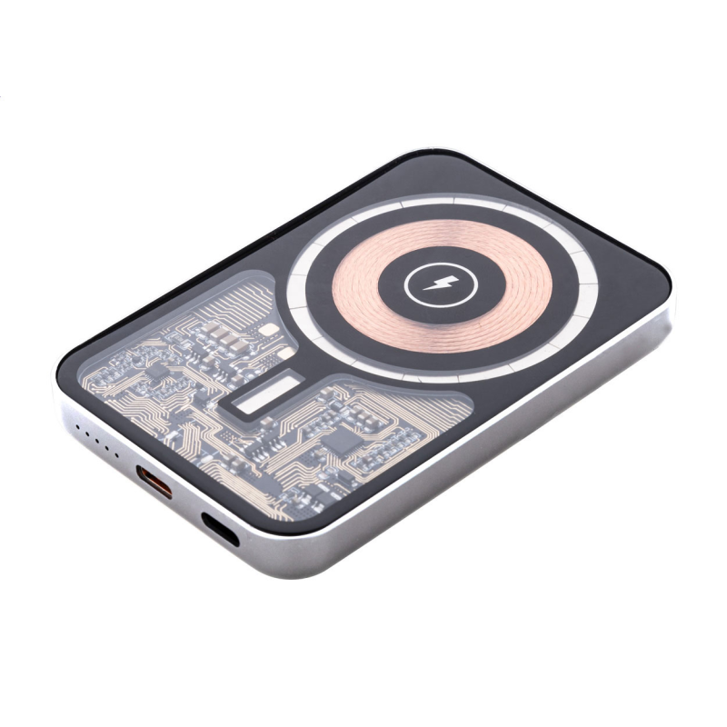 Újrahasznosított alumínium power bank félig átlátszó borítással és látható elektronikus alkatrészekkel.