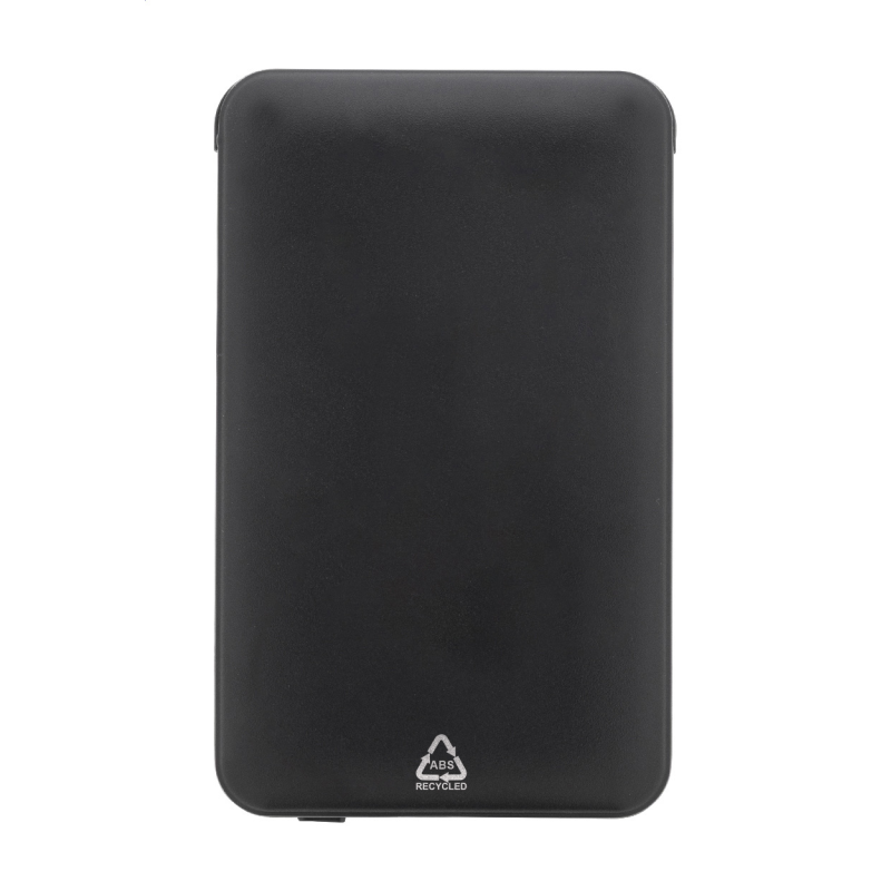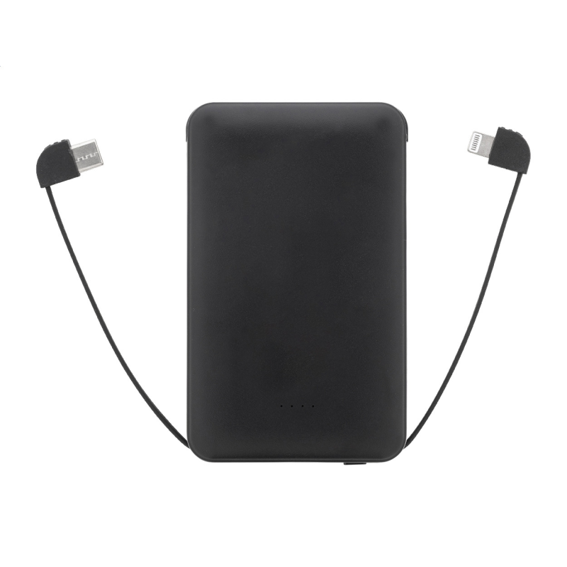 Újrahasznosított ABS műanyag power bank 5000 mAh-s akkumulátorral és integrált töltőkábelekkel, micro USB, USB-C és Lightning csatlakozókkal.