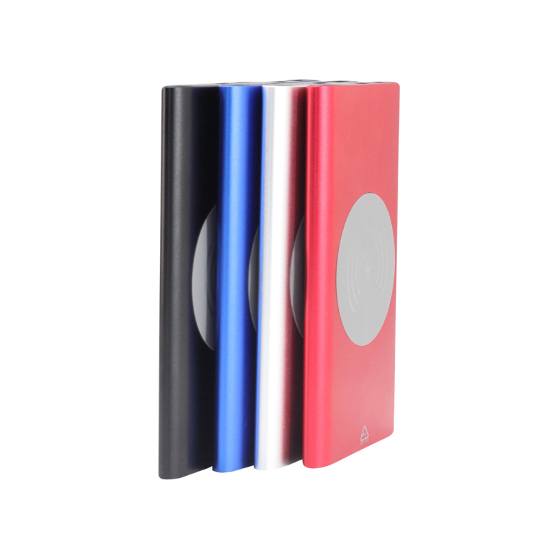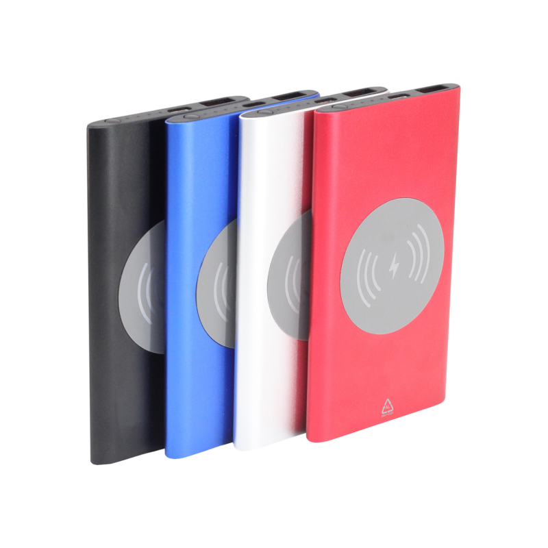 Újrahasznosított alumínium USB power bank, beépített vezeték nélküli gyorstöltővel (15W) és 4000 mAh akkumulátorral.