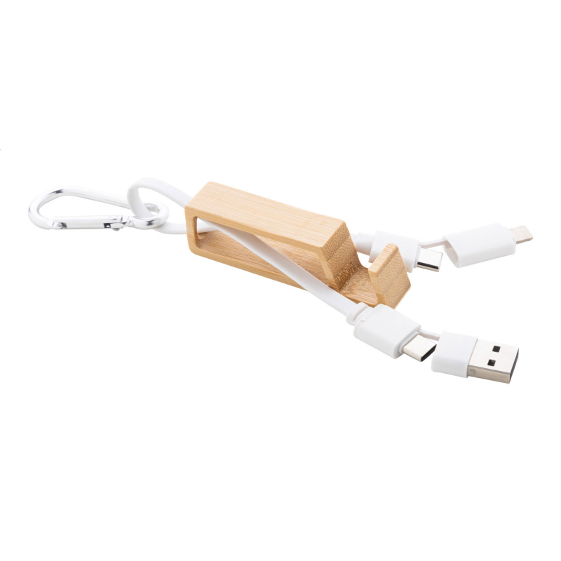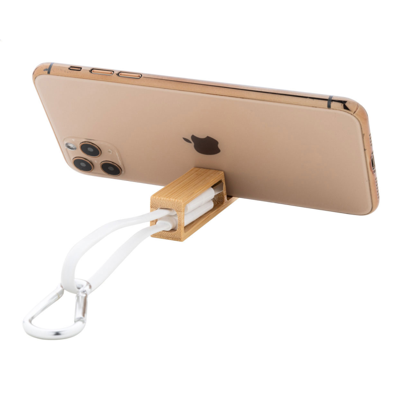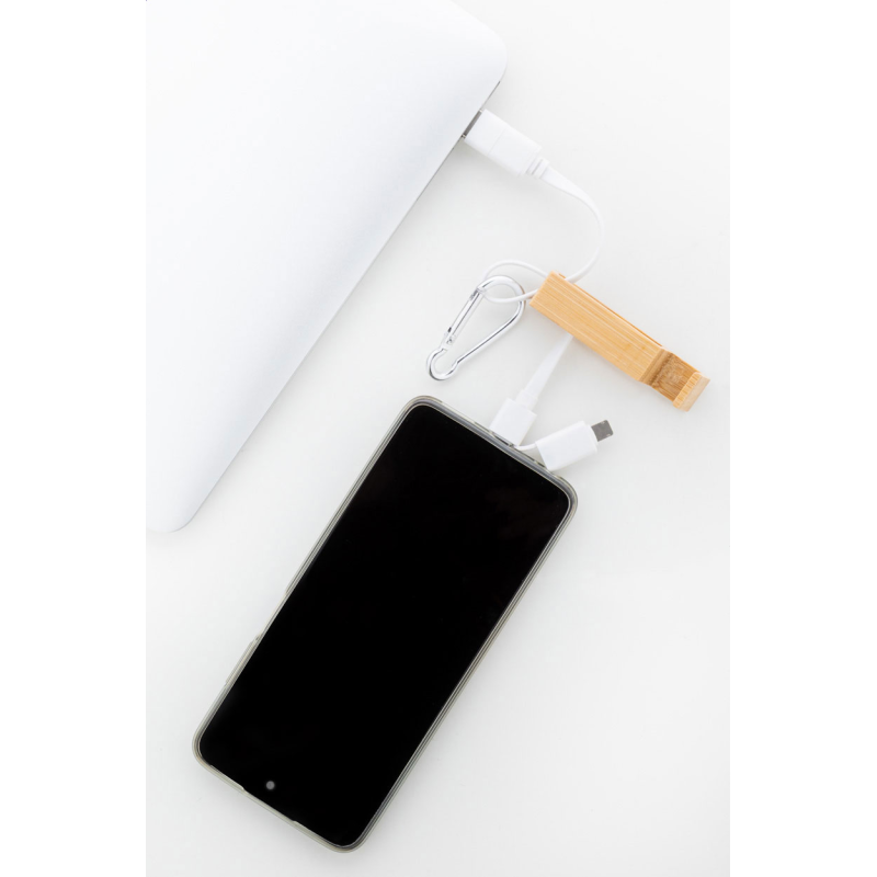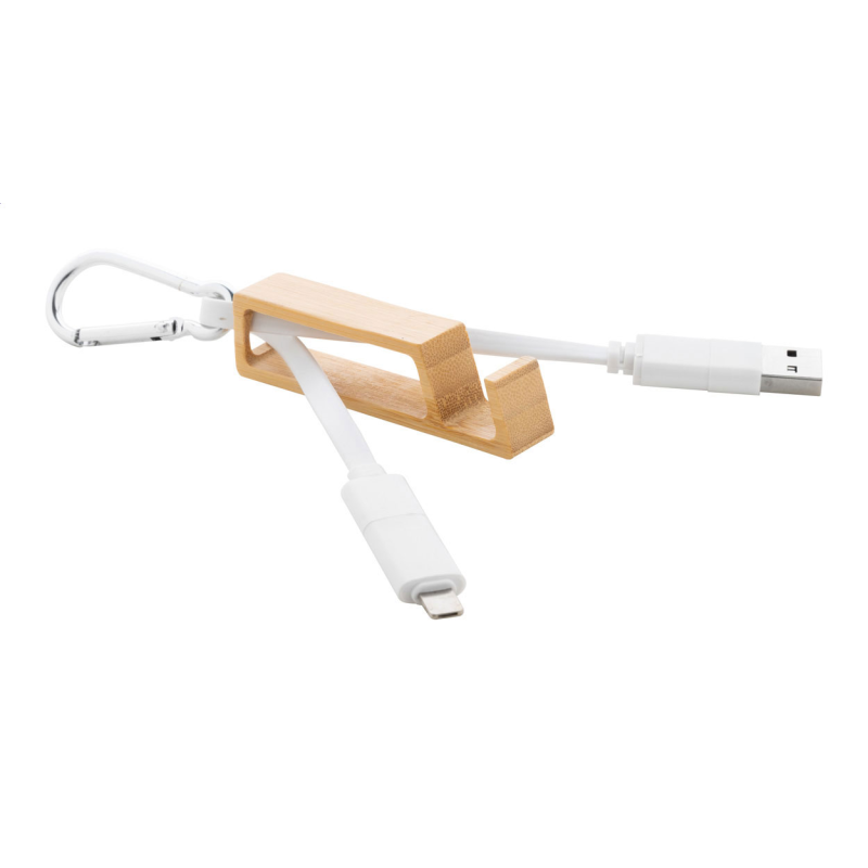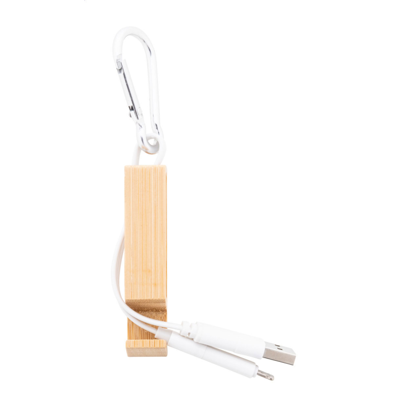 USB töltőkábel újrahasznosított alumínium karabinerrel és bambusz mobiltartóval.