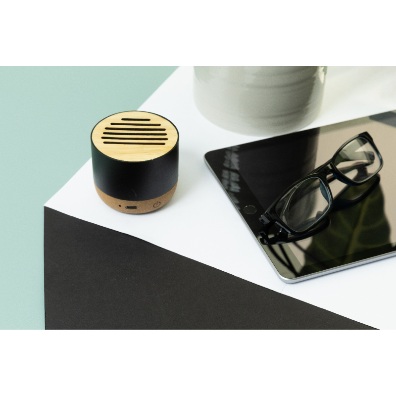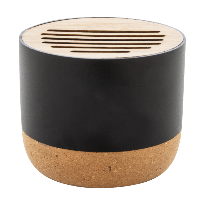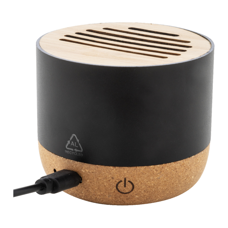 Vezeték nélküli hangszóró újrahasznosított alumínium házban, bambuszhálóval és természetes parafa talppal.