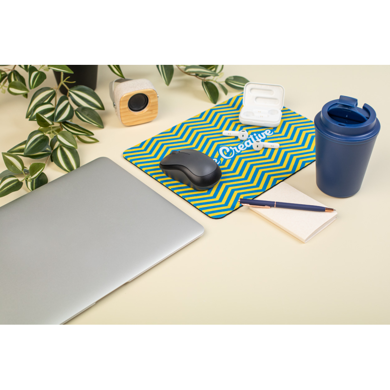 Összecsukható RPET poliészter egérpad szilikon alappal. Beépített vezeték nélküli gyorstöltővel (15W) és bambusz mobiltelefon-tartóval. 300D RPET poliészter. USB töltőkábellel szállítjuk.