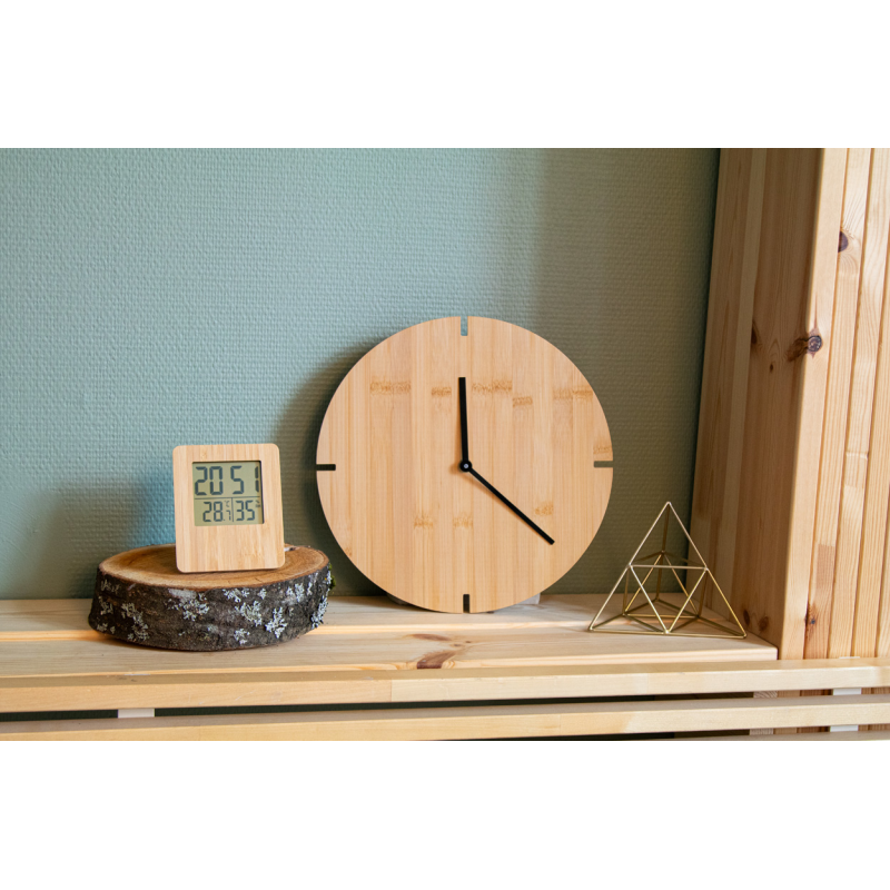 Időjárás állomás és digitális óra bambusz előlappal.