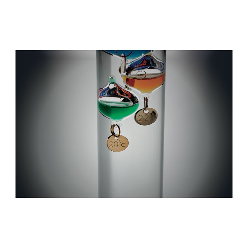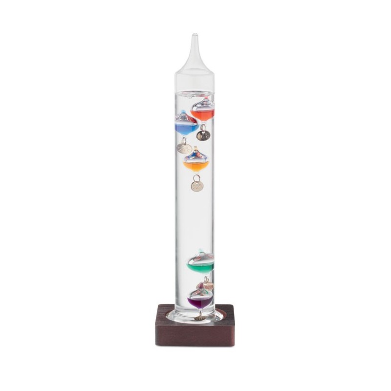 Galileo hőmérő üvegből, öt színes lebegő gömbbel és fa talppal.