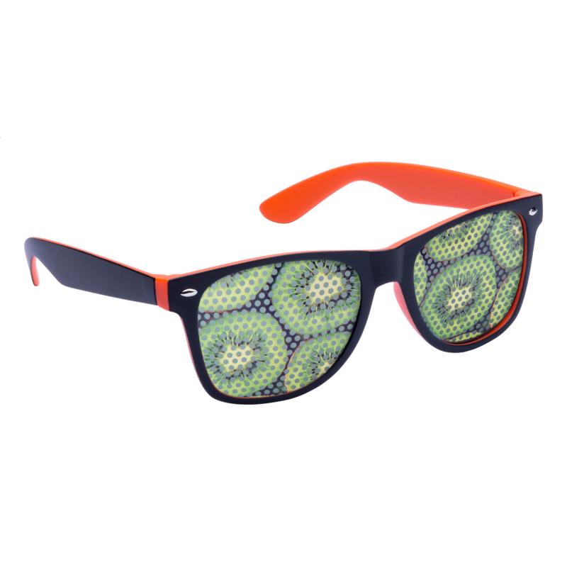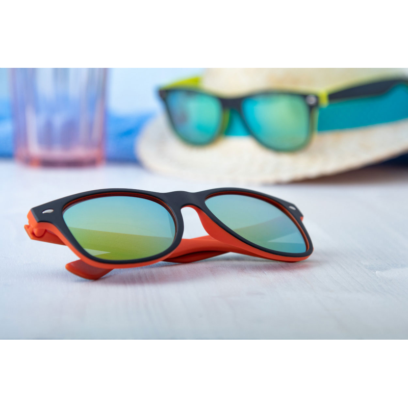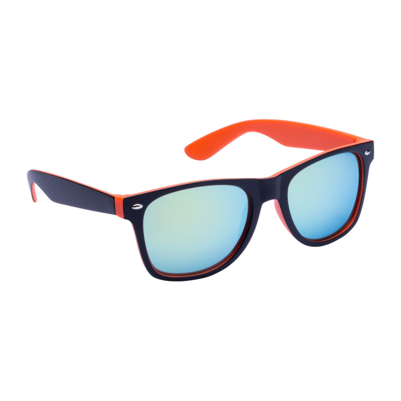 Műanyag napszemüveg kétszínű kerettel, foncsorozott lencsékkel és UV 400 fényvédelemmel ellátott.
