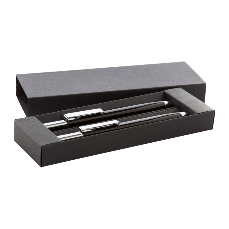 2 darabos toll szett fekete, mágneszáras karton dobozban. A szett egy-egy fémből készült, gumírozott roller és golyóstollat tartalmaz. Fekete tollbetéttel szállítjuk.