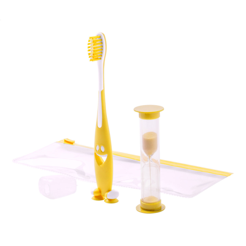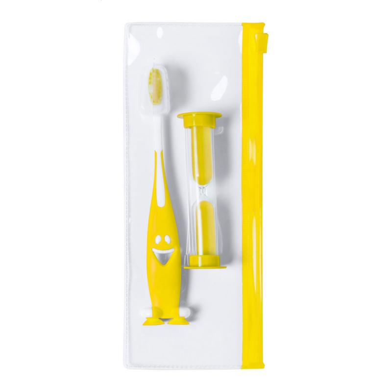 Fogkefe szett gyerekeknek, műanyag fogkefével és homokórával. Cipzáras műanyag tartóban szállítjuk.