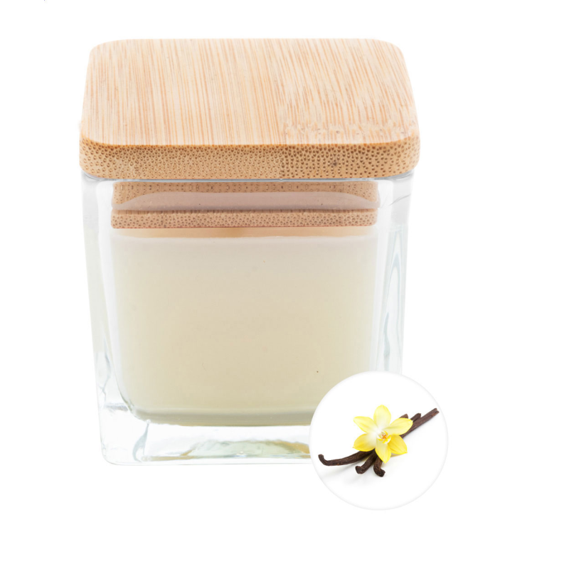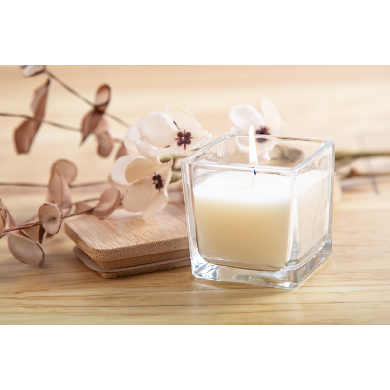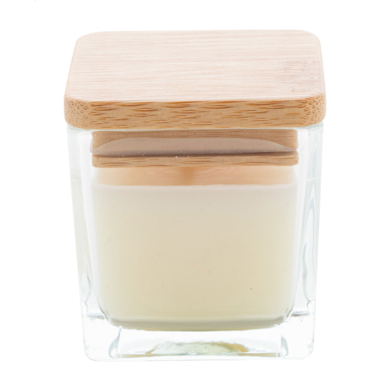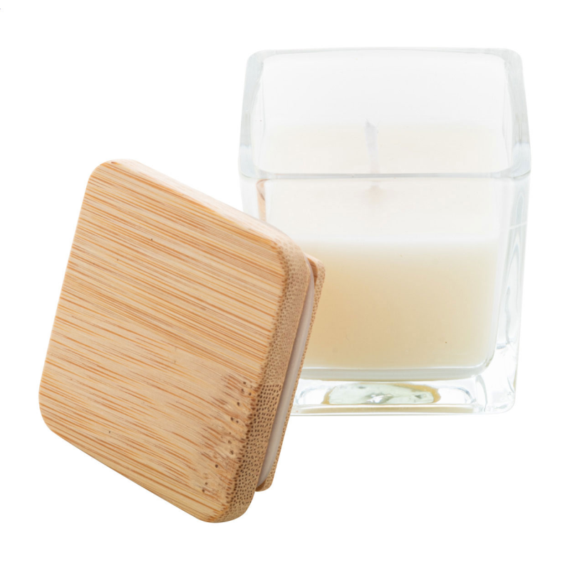 Növényi alapú illatgyertya bambusz fedelű üvegtartóban, 50 gramm viasszal.