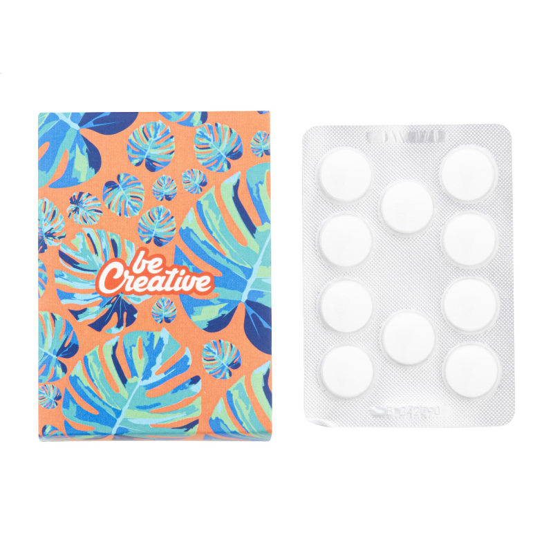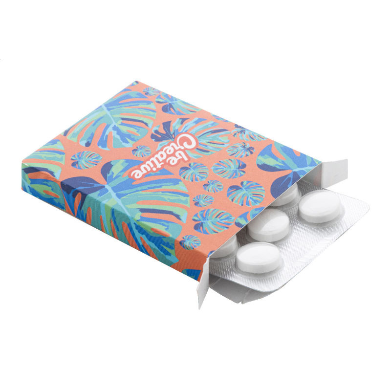 10 db nagy méretű mentolos cukorka bliszterben, egyedi gyártású, full-colour nyomtatott papír dobozban.