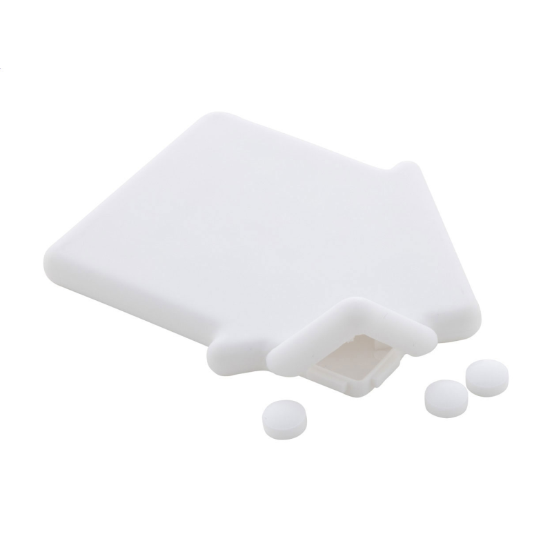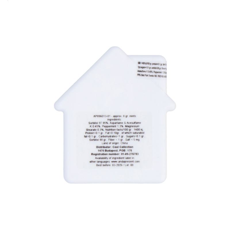 Házikó alakú műanyag cukorka adagoló, kb. 8 gramm cukormentes mentolos cukorkával.