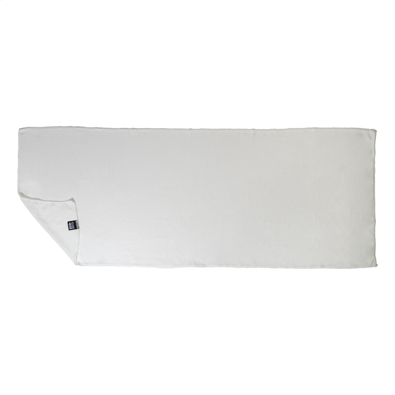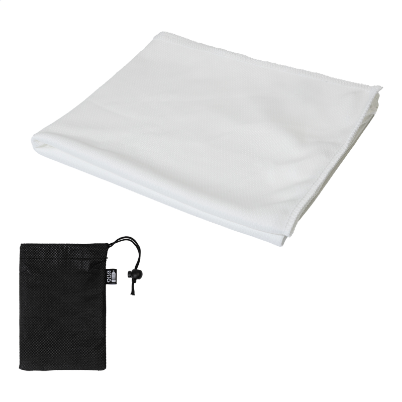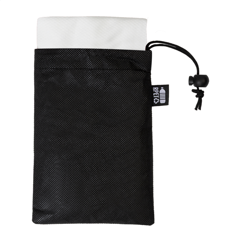 RPET mikroszálas sporttörölköző RPET non-woven hordtáskában, megkülönböztető RPET címkével. RPET poliészter, 140 g/m²