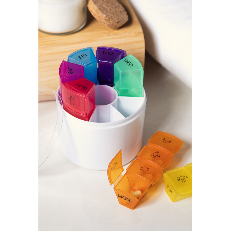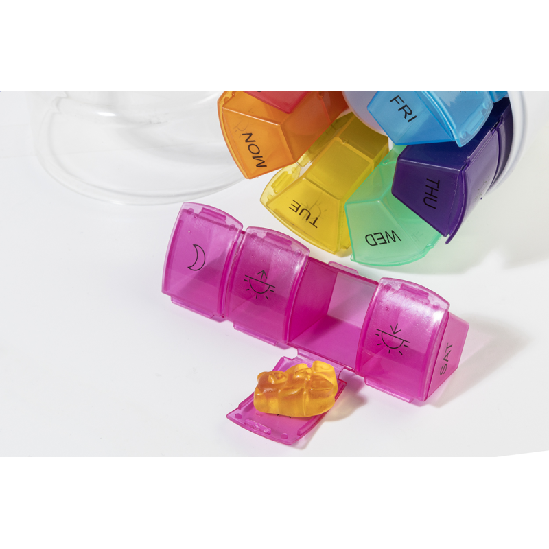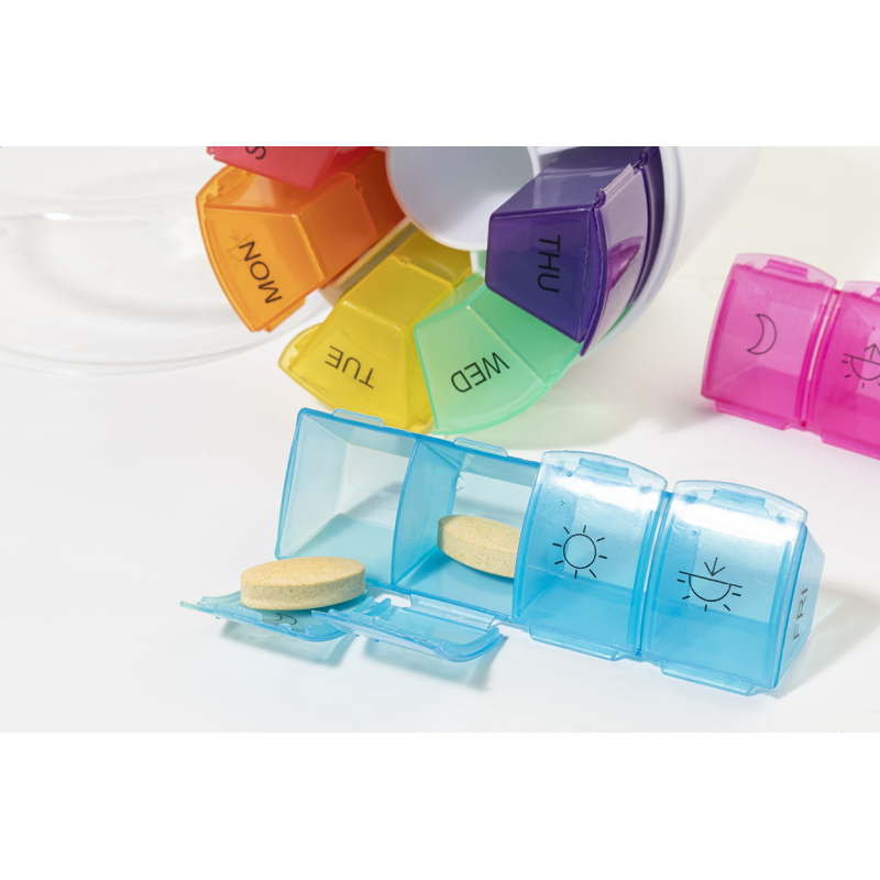 Újrahasznosított ABS heti beosztású gyógyszeradagoló 7 napi dobozzal, egyenként 4 rekesszel a nap különböző szakaszaihoz.